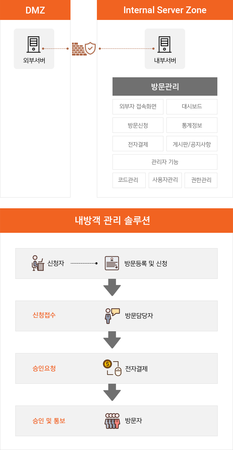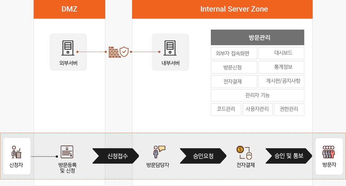 내부 담당자가 확인 및 승인을 통해 방문을 허용해주며, 실제 방문자 관리 및 출입 통제를 실시합니다.