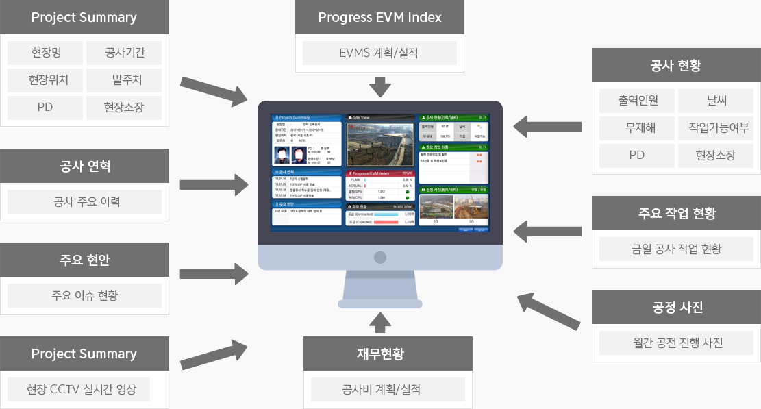 각 정보는 회사 및 현장의 다양한 시스템과 인터페이스를 통해 실시간 수집/가공하여 제공합니다.