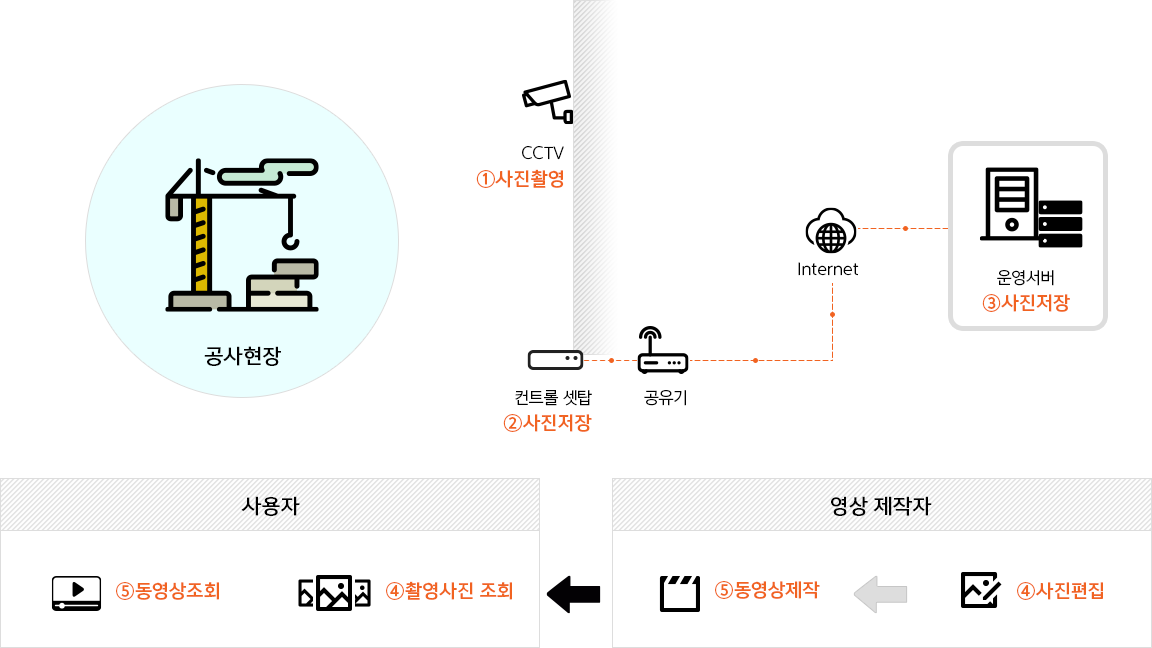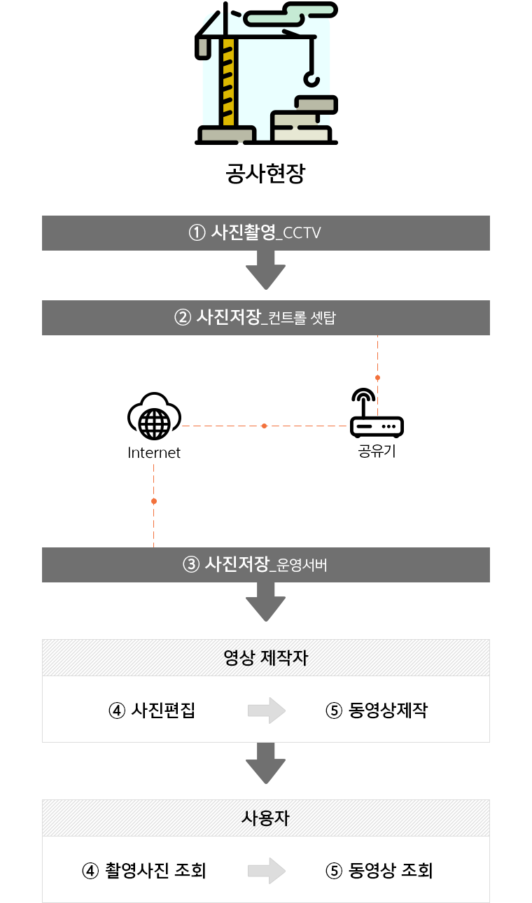 일반 CCTV를 활용하여 일정 시간 간격으로 공사 진행 상황을 촬영하여 3개월, 6개월, 1년, 전체공정 주기로 빠른 배속의 홍보영 공사지 영상을 제작합니다.