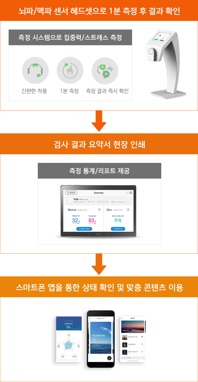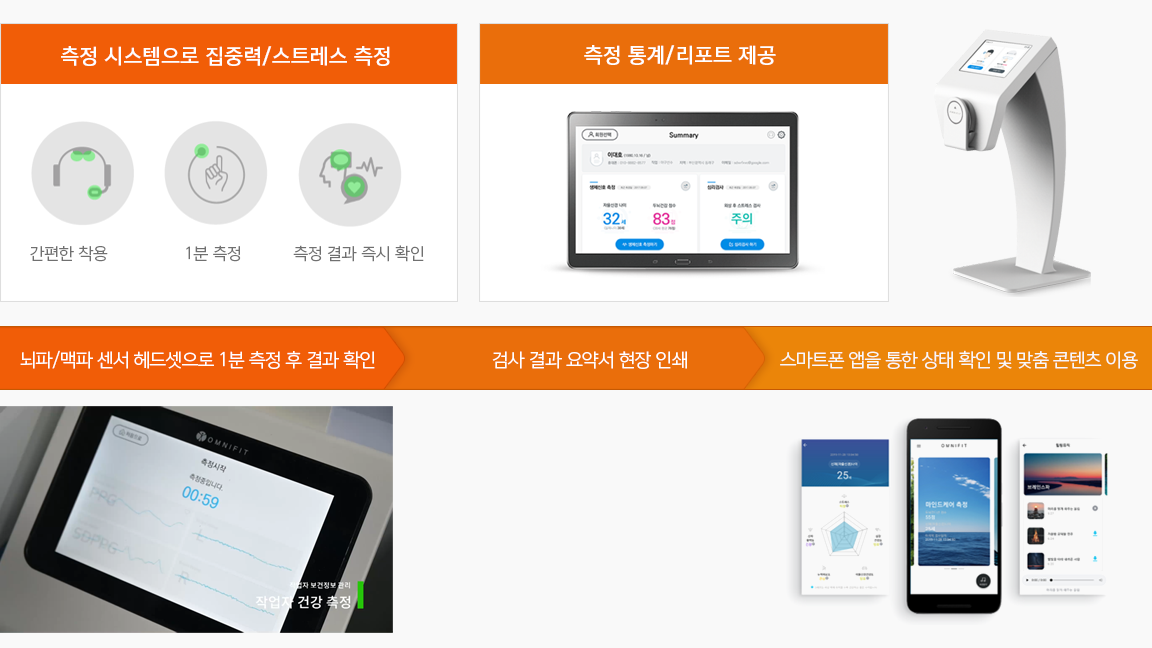 근로자의 뇌파/맥파를 측정하여 스트레스나 정신건강 상태를 지속적으로 측정하고 관리하여, 이상 징후 발생이 의심되는 근로자를 집중 관리할 수 있습니다.